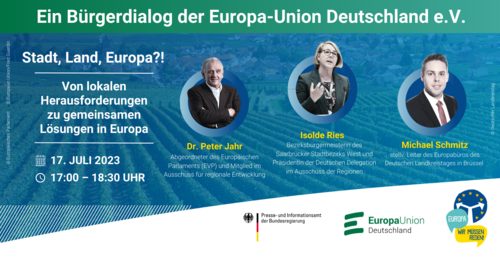 Diskutieren Sie am 17. Juli 2023 um 17 Uhr in unserem Online-Bürgerdialog mit Isolde Ries, Präsidentin der deutschen Delegation im Ausschuss der Regionen und Bezirksbürgermeisterin des Stadtbezirks Saarbrücken West, Dr. Peter Jahr (MdEP), Mitglied im Ausschuss für regionale Entwicklung des Europäischen Parlaments, sowie Michael Schmitz, stellvertretender Leiter des Europabüros des Deutschen Landkreistages in Brüssel, über die Bedeutung der Europäischen Union für unsere Regionen, Städte und Gemeinden. » weiterlesen