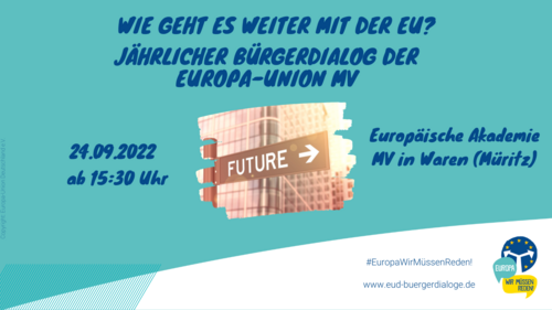 Die Europa-Union Mecklenburg-Vorpommern lädt in Kooperation mit der Europa-Union Deutschland zum jährlichen Bürgerdialog „Wie weiter mit der Europäischen Union“ am Sonnabend, den 24.09.2022, ab 15.30 Uhr in die Europäische Akademie Mecklenburg-Vorpommern in Waren (Müritz), Eldenholz 23, ein. » weiterlesen