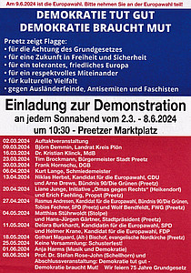 „Demokratie tut gut – Demokratie braucht Mut!“ Unter diesem Motto rufen engagierte Preetzer Demokratinnen und Demokraten seit einigen Wochen dazu auf Flagge zu zeigen für Toleranz, kulturelle Vielfalt und ein friedliches Europa.