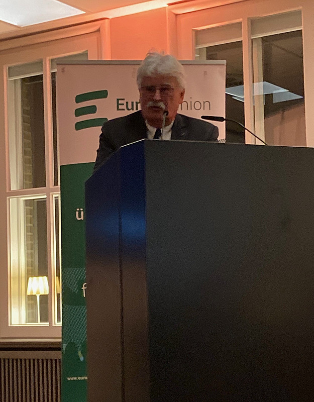 Im Anschluss überbrachte Ministerpräsident und Europa-Unions-Mitglied, Daniel Günther, per Videobotschaft seine besten Glückwünsche zum Ausdruck und bedankte sich für das jahrzehntelange Engagement des Verbandes. Nach einem weiteren musikalischen Leckerbissen des Saxophonquartetts hielt EUD-Ehrenpräsident Elmar Brok die Festrede. Der langjährige Europapolitiker forderte die Mitglieder auf, wieder aktiver zu werden und den Menschen klar zu machen, dass die Errungenschaften Europas nicht selbstverständlich seien. „Wir müssen wieder laut und aktiv sein und wir müssen auch der nächsten Bundesregierung, egal wie diese aussehen wird, au die Nerven gehen. Wir dürfen nicht nachlassen.“, so Brok.
