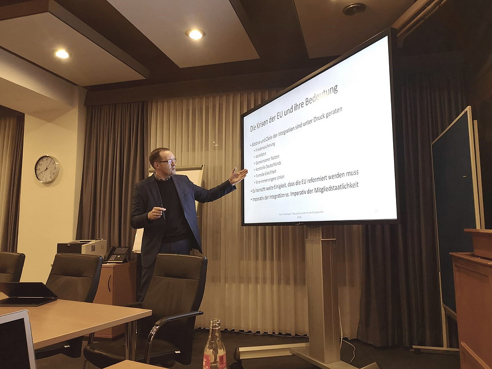Der Europa-Experte referierte über die Grundzüge und ursprünglichen Motive der europäischen Integration und mahnte Reformen an. Die Reformvorschläge des französischen Staatspräsidenten Emmanuel Macron wären eine gute Gelegenheit für systematische Verbesserungen gewesen, die aber nicht genutzt worden sei. Nach Knelangen bräuchte es in der EU mehr Mut für europäische Lösungen. Es gelte unter anderem, das europäische Parlament zu stärken, eine soziale Dimension der EU zu ergänzen und die geopolitische Lage der EU ernster zu nehmen.