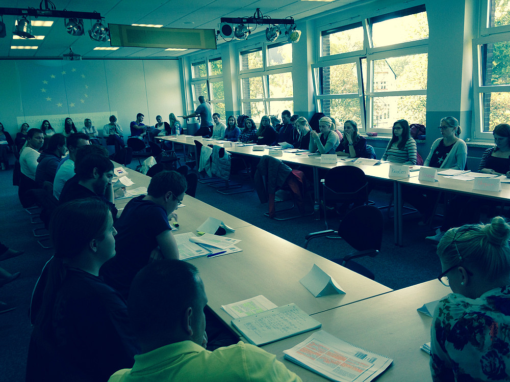 Die Schüler_innen begaben sich in ihre jeweiligen Gruppen und diskutierten anhand des Materials, ob und unter welchen Bedingungen ein Bewerberstaat aufgenommen werden könnte. Es herrschte eine gute Arbeitsatmosphäre und die Schüler_innen waren konzentriert dabei. Die Teamer und Lehrer standen für Fragen zur Verfügung, die aber selten aufkamen.