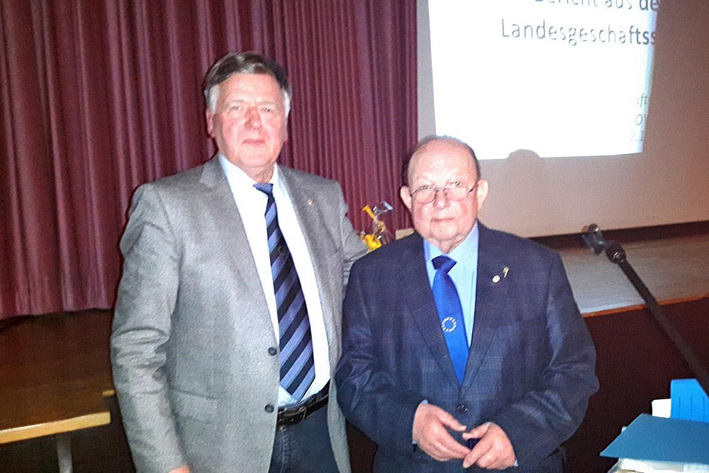 Der Gründungsvorsitzende, Gerhard Beuck, leitet den Ortsverband nach 32 Jahren 2 weitere Jahre. Neu gewählt wurden Claus Hermann Hansen, Tarp, Michael Montag, Tarp, und Eckhard Sarnow, Barderup. "Mit dieser Verstärkung sehen wir optimistisch in die Zukunft," meinte der Vorsitzende und freute sich über die einstimmigen Voten. Neue Kassenprüfer wurden Herbert Jensen und Volker Storm. Der seit 1993 wirkende Geschäftsführer Günter Will erhielt vom Bundesverband der Europa-Union die "goldene Ehrennadel" des Verbandes in Würdigung seiner besonderen Verdienste. Die ebenfalls ausgeschiedenen Beisitzer Claus Festing und Klaus Hansen erhielten Präsente. Gerhard Beuck dankte ihnen für ihren unermüdlichen Einsatz.