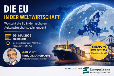 Welche Rolle spielt die EU in den globalen Außenwirtschaftsbeziehungen? Dieser Frage widmet sich eine Vortragsveranstaltung mit dem Wirtschaftswissenschaftler Prof. Dr. Langhammer am 5. Mai 2026. Prof. Langhammer war von 1997 bis 2012 Vizepräsident des IfW Kiel, ist als Außenwirtschafts- und Entwicklungsökonom weiterhin am Kiel Institut für Weltwirtschaft tätig.