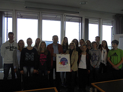 Am 22. September 2015 erhielten die Schülerinnen und Schüler aus den Händen der Flensburger Stadtpräsidentin Swetlana Krätzschmar und den beiden Vorstandsmitgliedern der Europa Union Deutschland Kreisverband Flensburg, Frau Buhl und Herrn Winkelmann, eine Urkunde und eine entsprechende Auszeichnung. Lina Klingsporn und Arlene Scheel aus der 7. Klassenstufe wurden für ihr Tagebuch „Bildung für alle“ ausgezeichnet. Kaja Battiston und Christopher Langrzik haben sich in einem Comic mit dem Thema „Festung Europa“ auseinandergesetzt und dafür den Europapreis bekommen.