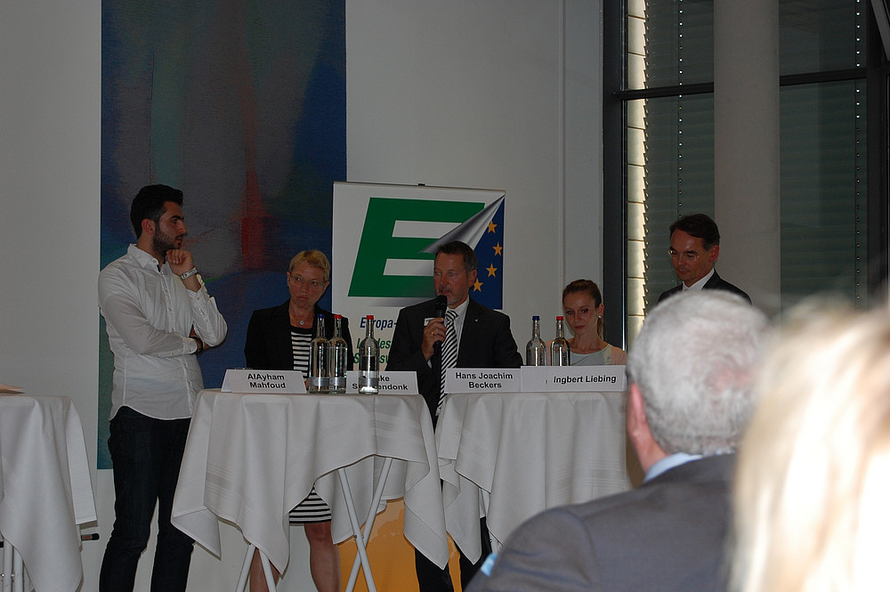 Die aktuelle Asyldebatte und der seit langem diskutierte Fachkräftemangel gehörten zusammen, so Hans Joachim Beckers von der IHK. Viele der Geflüchteten seien gut ausgebildet - ihre schnelle Integration auf den europäischen Arbeitsmarkt sei für beide Seiten eine Bereicherung. Von Seiten der Flüchtlinge und der Unternehmer sei eine große Bereitschaft vorhanden, aufeinander zuzugehen, so Beckers. Die IHK mit ihrer großen Expertise und Kontakten biete sich hier als Netzwerker an. Er forderte allerdings von der Politik verlässliche Rahmenbedingungen und Rechtssicherheit: nur, wenn ein Unternehmen sicher sein könne, dass ein Geflüchteter nicht während oder direkt nach der Ausbildung von Abschiebung bedroht sei, lohne sich die Investition für die Firma.
