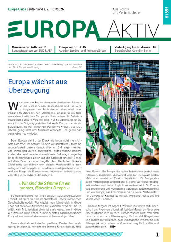 „Acht Jahrzehnte Einsatz für ein föderales, demokratisches Europa sind kein Anlass für Selbstzufriedenheit, sondern Verpflichtung. Wer 80 Jahre lang für die europäische Einigung gestritten hat, weiß: Europa war nie ein Selbstläufer. Es war immer ein politisches Projekt, das Mut, Überzeugungskraft und Ausdauer verlangte. Und genau das verlangt es heute wieder“, schreibt EUD-Präsidentin Prof. Dr. Andrea Wechsler im Editorial dieser Ausgabe.