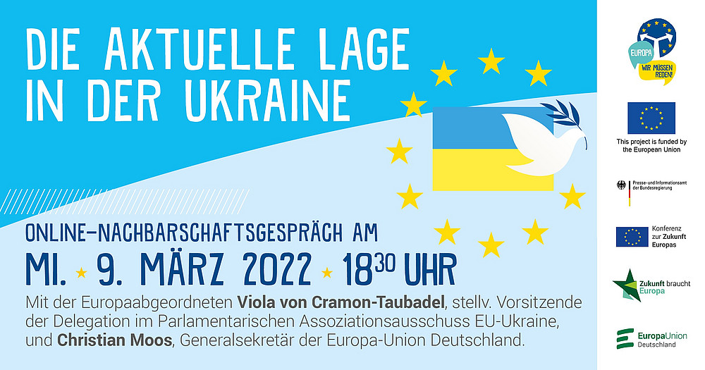 Wir laden Sie am Mittwoch, den 9. März 2022, von 18:30 Uhr bis 19:30 Uhr herzlich ein zu unserem Online-Nachbarschaftsgespräch zur aktuellen Lage in der Ukraine. Bringen Sie Ihre Anliegen und Fragen ein und treten Sie in den virtuellen Dialog mit: