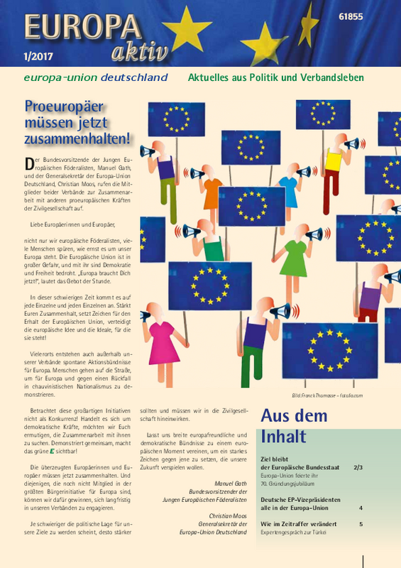 Die erste Europa aktiv Ausgabe des neuen Jahres blickt zurück auf die Feierlichkeiten der Europa-Union zu ihrem 70. Jubiläum und präsentiert die großen Projekte für 2017. Mit Blick auf die wachsende EU-Feindlichkeit rufen EUD-Generalsekretär Christian Moos und der JEF-Bundesvorsitzende Manuel Gath zur Zusammenarbeit mit anderen proeuropäischen Initiativen auf. Gelegenheit zur Mitwirkung bieten nicht nur der „March for Europe“ am 25. März in Rom und Berlin, sondern auch die neue Bürgerdialogreihe „Und jetzt, Europa?“ und das Seminar des Kommunalen Netzwerks in Magdeburg. Wie groß das Angebot an Veranstaltungen und Aktionen in den Landes- und Kreisverbänden ist, wird auch in der aktuellen Ausgabe wieder offensichtlich.
