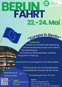 Vom 22. bis 24. Mai 2024 unternehmen die Jungen Europäischen Föderalist*innen eine Berlin-Exkursion. Kurzentschlossene können sich noch bis Mitte nächster Woche anmelden. Euch erwartet ein…