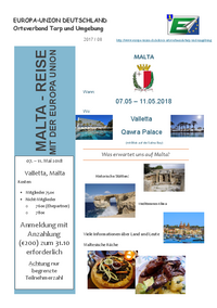 Für die Malta-Reise des Ortsverbandes Tarp vom 7-11. Mai 2018 sind noch zwei Plätze frei geworden. Wer Interesse hat, meldet sich gern beim Vorsitzenden Gerhard Beuck. Ausführliche Informationen gibt…