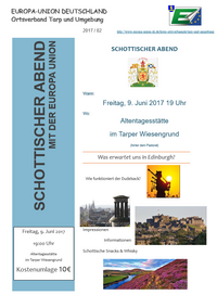 Zur Einstimmung auf eine Edinburgh-Reise, die der Ortsverband der Tarper Europa-Union vom 1.-6. September 2017 durchführen wird, fand im Tarper Wiesengrund ein "Schottischer-Abend" statt.